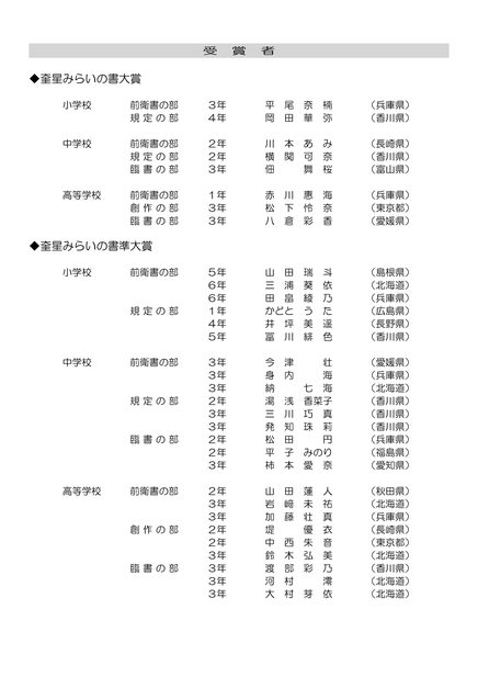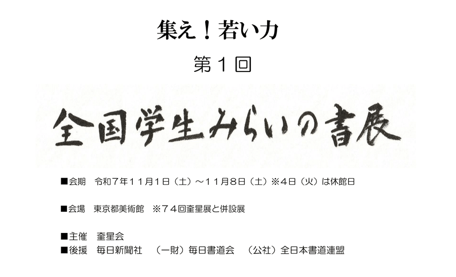 学校教育の中に位置づけられる書教育を推進するとともに、次代を担う児童生徒たちの自由 な書表現の発表の場を作り、未来の書道界を担う人材を育てることを目的とします。